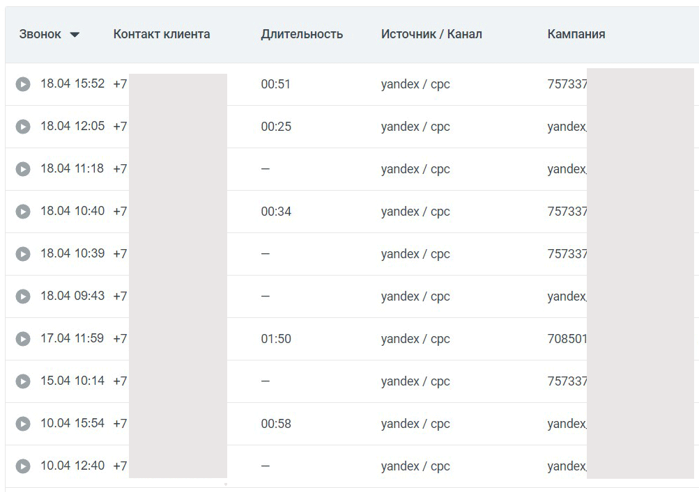 Телефоны реальных клиентов и полные названия кампаний я скрыл. Проанализировав заявки (обращения)