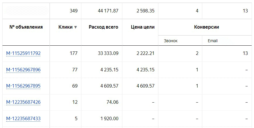 Видно, что первое объявление самое эффективное, а вторые 2 наоборот, намного хуже.