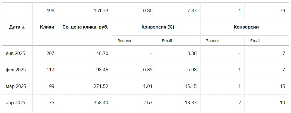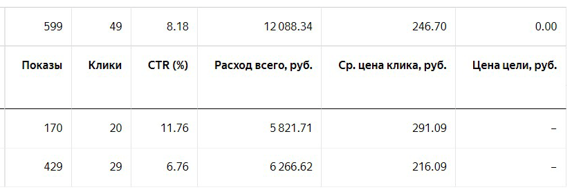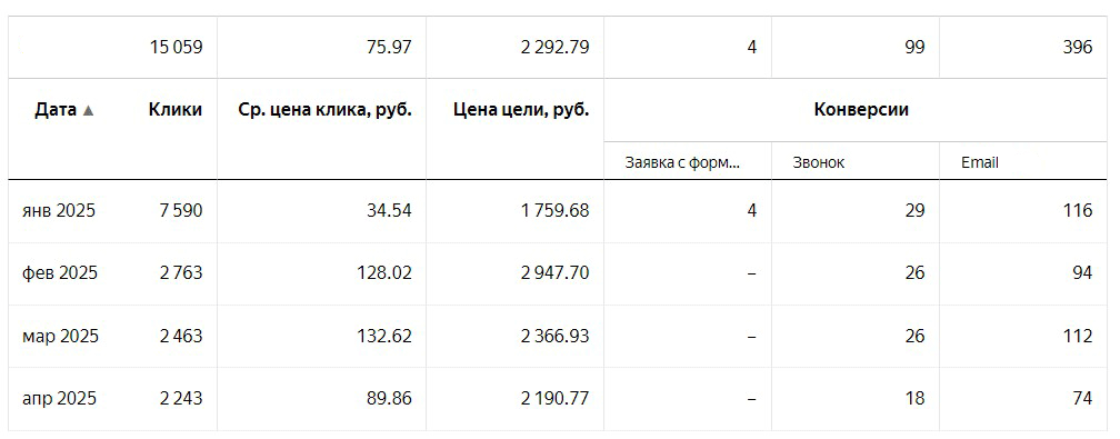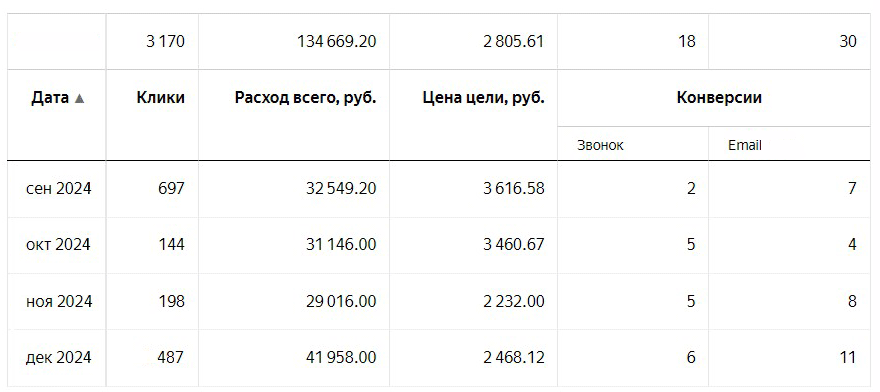Достижение этих целей указано в таблицах ниже. Конечно, были и повторные заказы, были заявки с других источников (SEO, доски объявлений), но у этого предприятия большую долю занимал канал платной рекламы (Яндекс Директ). В целом всё работало, но хотелось улучшить показатели рекламы, детальнее разобраться в аналитике.